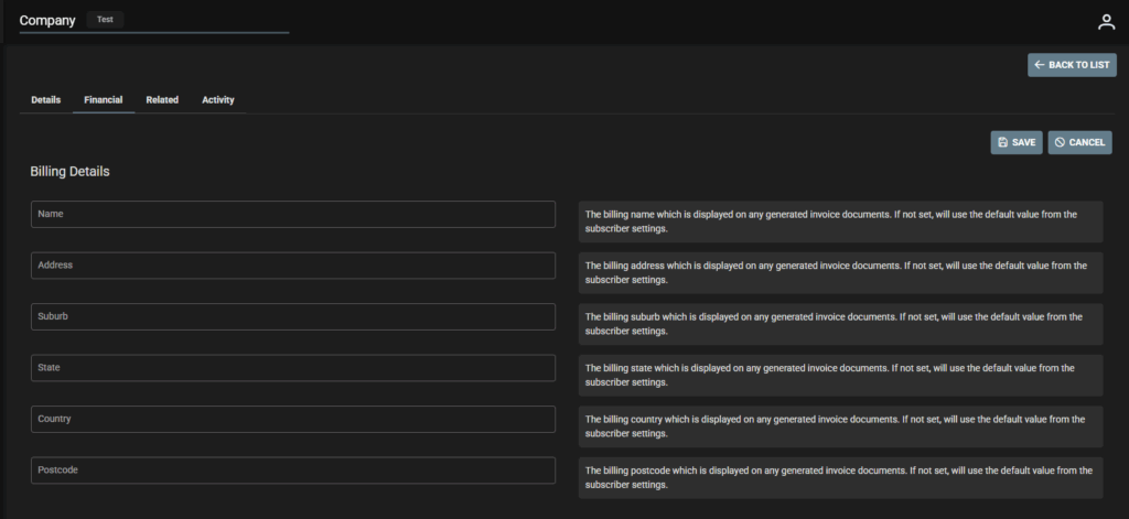 Note! Company Financial Tab over rides Subscriber Settings so if set up in each Company this is where your system will get financial details from.