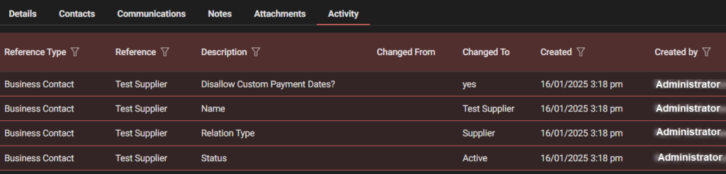 - Last tab: Activity will keep record of all activity in Supplier record as you fill out, modify or delete.