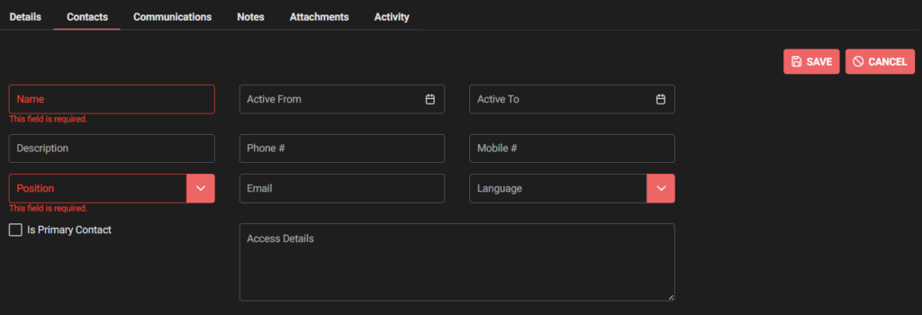 Fill out fields for each Contact –> Save when complete or Cancel if incorrect.