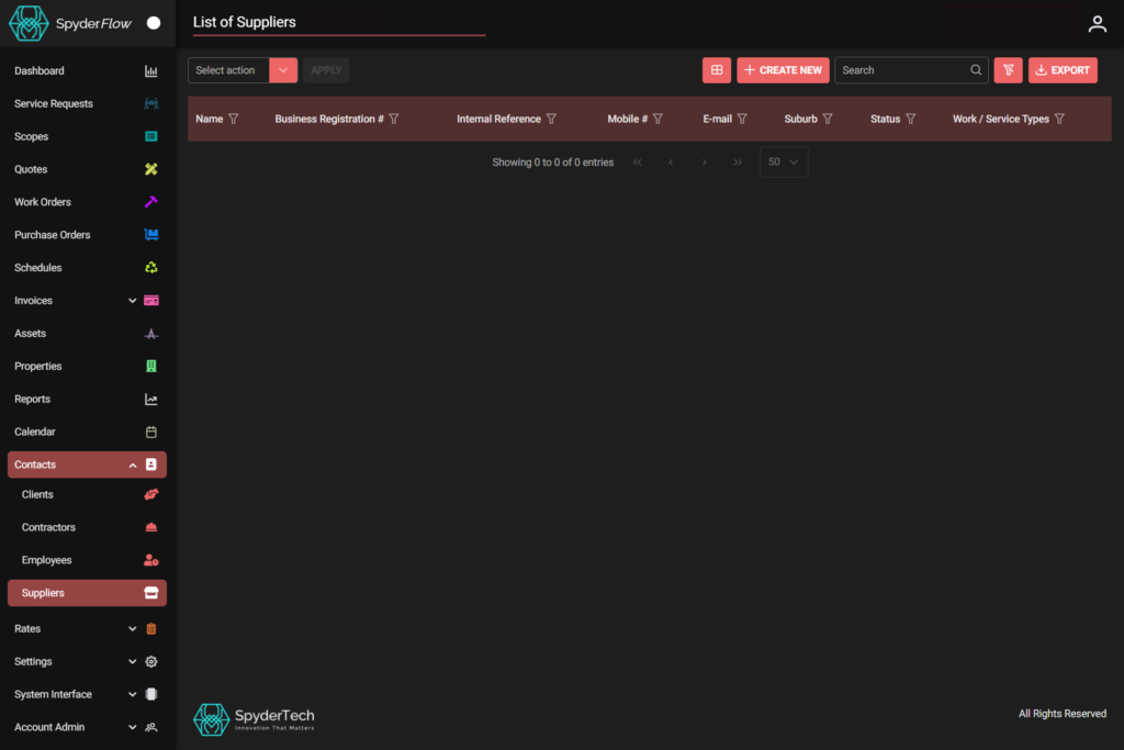 - Location: SpyderFlow Main Menu –> Contacts –> Suppliers