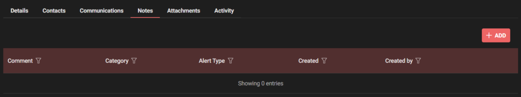 Notes Tab –> Click to +ADD notes –> Complete fields and Save