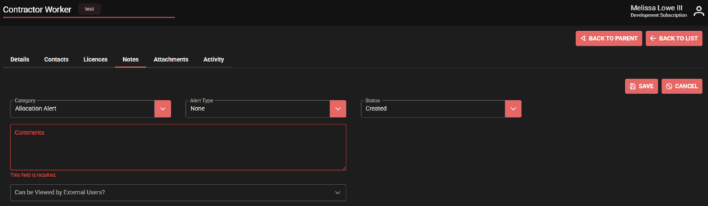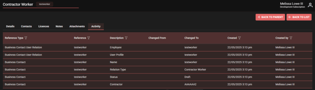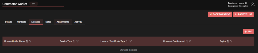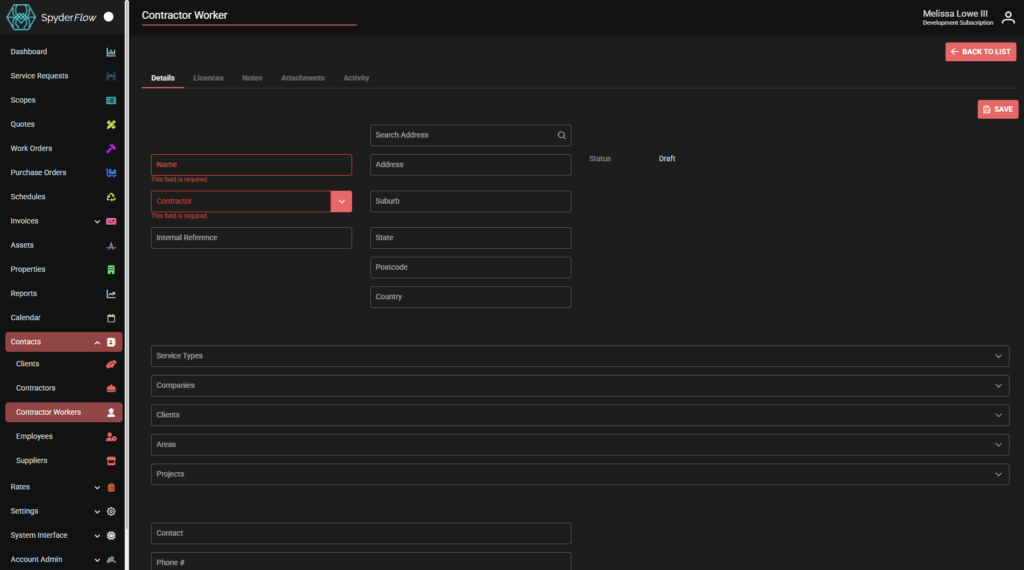 - Status – may be set up in Draft status if licences need to be added and then move to Review Required for Contractor to approve then flow to Active.