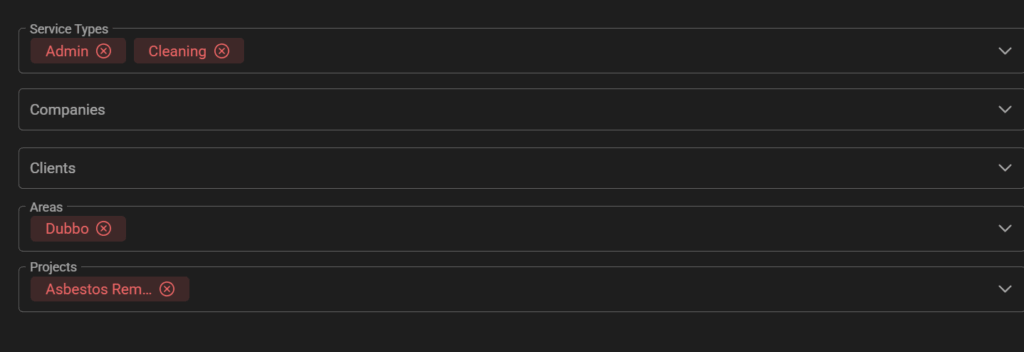 - Service Types: filter to the service type. eg. Admin, Electrical, Plumbing