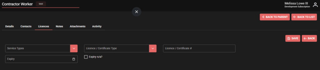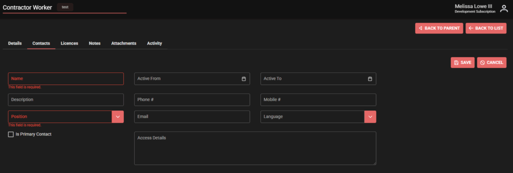 - Contractor: If the associated contractor does not show in dropdown go back to Contractor section and add, then complete worker. Note! Worker must have associated Contractor.