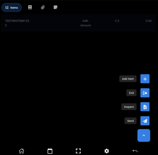 Bottom of this page is floating arrow –> Click arrow to show pop up menu: Add Item, Exit, Inspect, Send