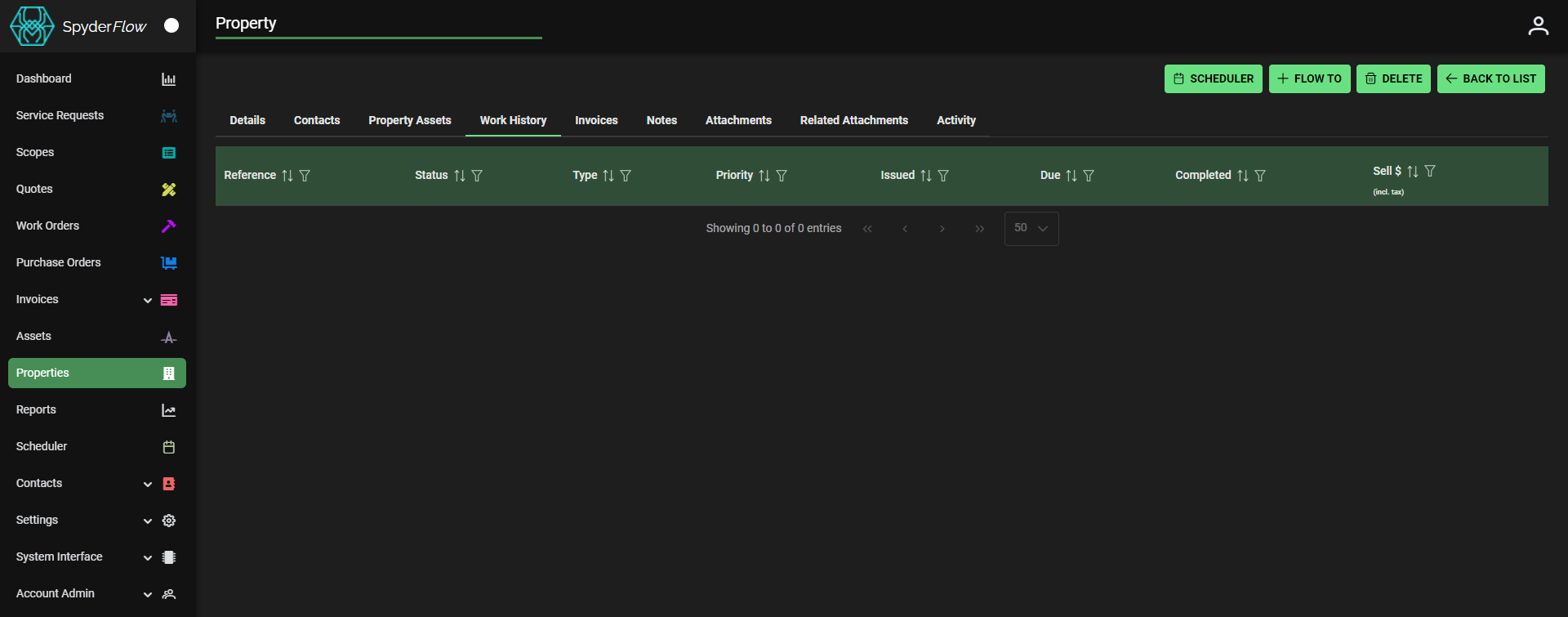 - Main Menu –> Properties –> List of Properties –> Select Property –> Work History