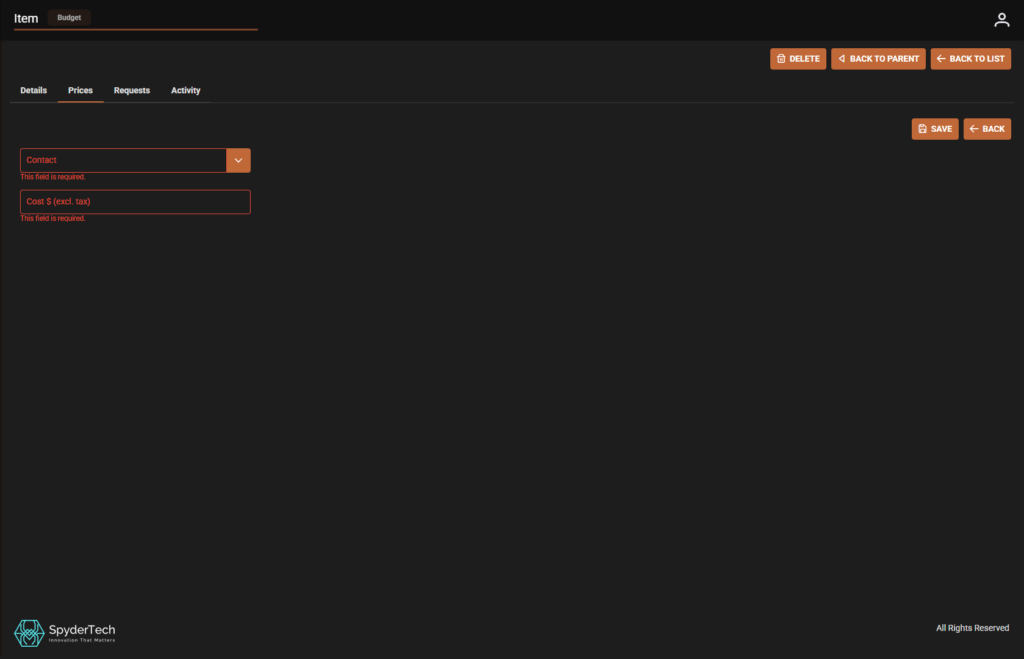 Other Tabs: Prices and Requests can be filled out in the Item section after the Details information is complete.