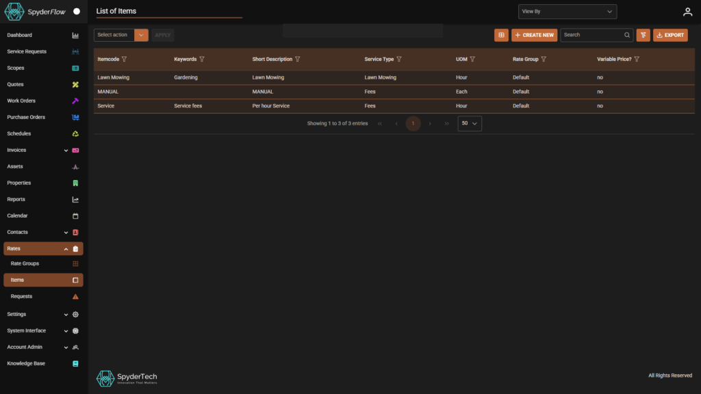 Note the example below are Items in 1 x Default Rate Group. Your organisation can work with one rate group or many depending on size and availability of items and requests you would like your users to access.