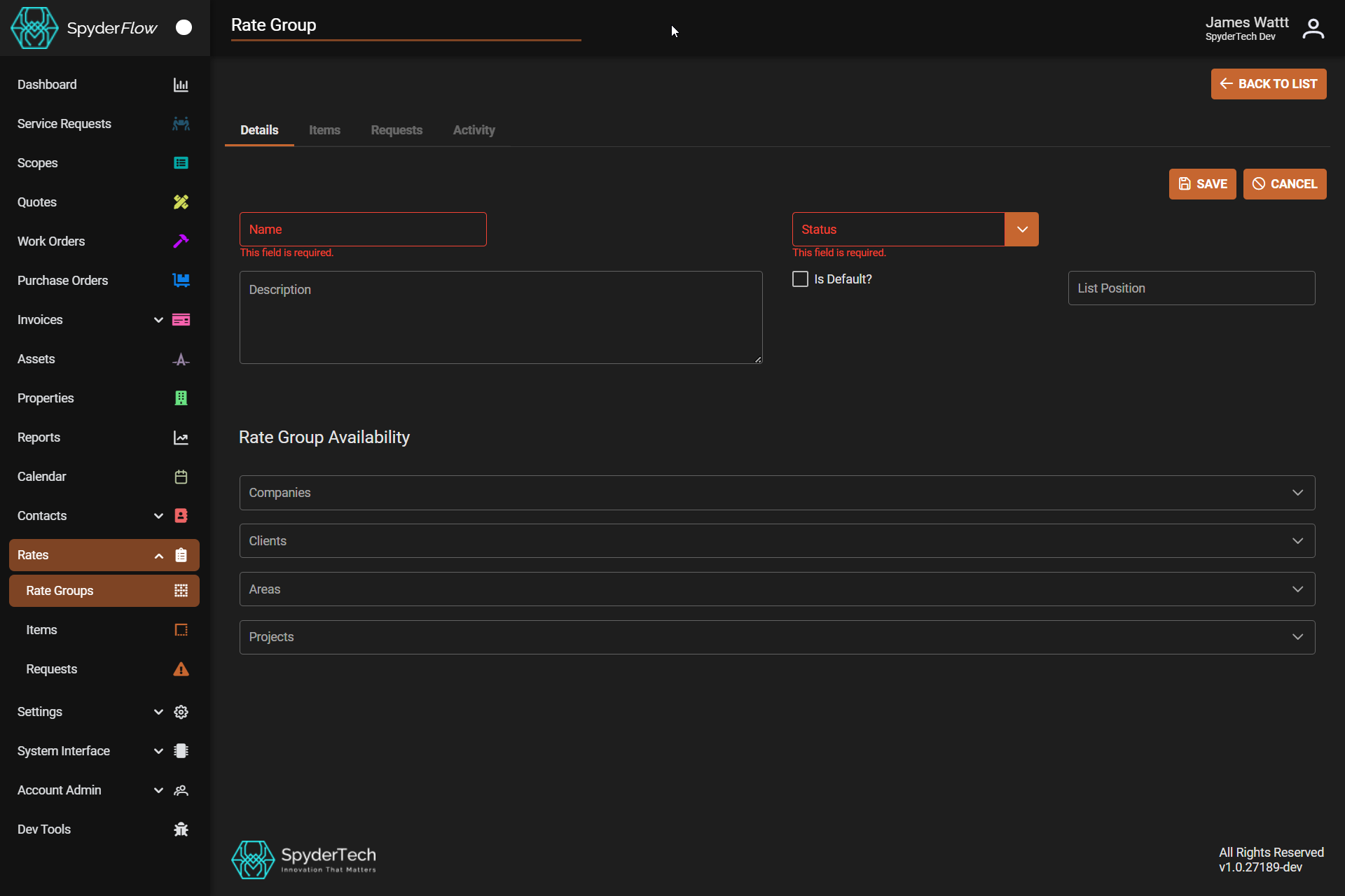 Location: Main Menu –> Rates –> Rate Groups –> List of Rate Groups –> +Create New –> fill Details page with information