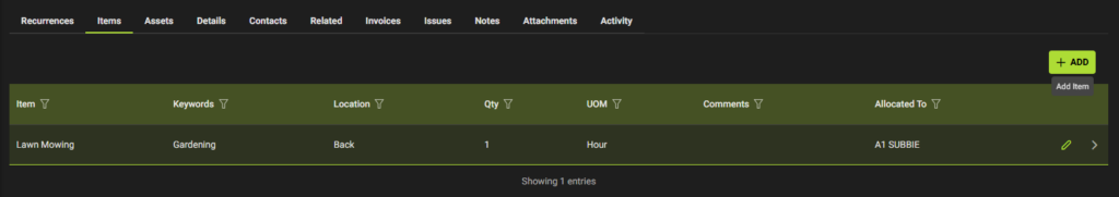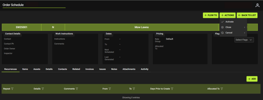- After Schedule Details are complete and Saved –> Go to Tabs: Recurrences, Items, Assets