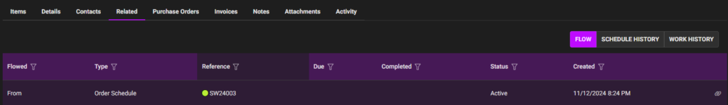 - When the schedule is activated it will produce work and purchase orders to view on Related tab