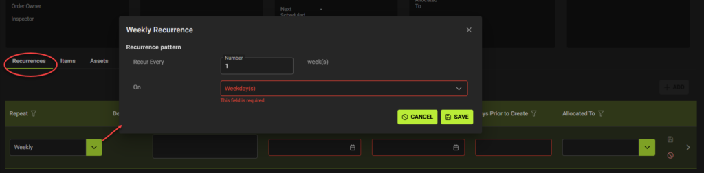 - +ADD for how often to Repeat, From Date, To Date , Days Prior to Create, Allocated To (who will do the work).