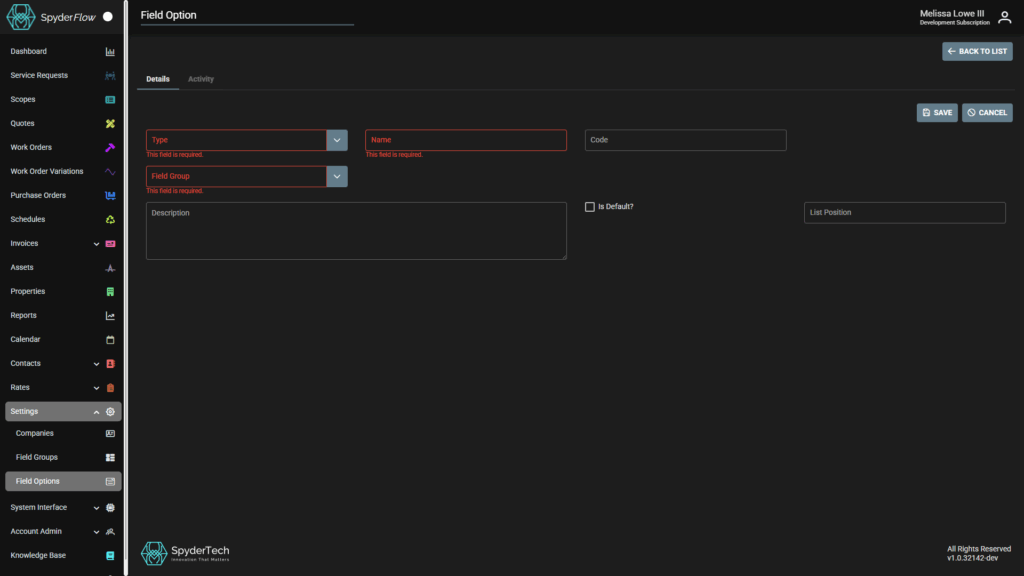 - Your System Administrator or Manager may configure the Field Groups and Field Options to be available in “Drop Down” field areas in your SpyderFlow.
