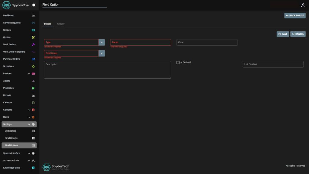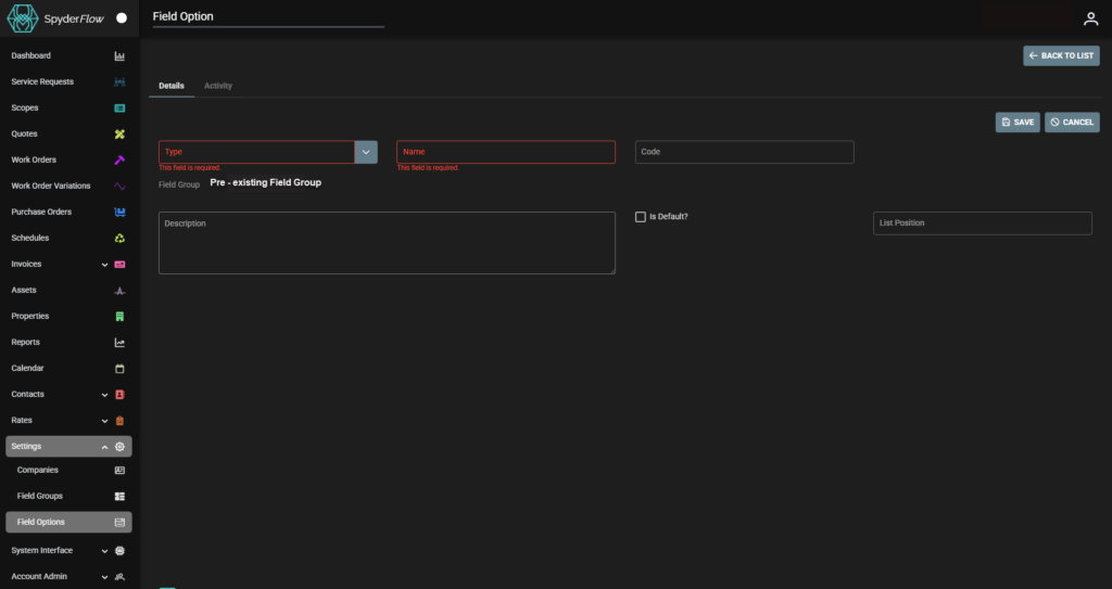 - Go to Main Menu > Settings > Field Groups > Select which Field Group you would like the Field Option to be in. Select Field Options Tab to +ADD a new field option for a drop down inside a pre existing field group. Choose Type (location and what type of dropdown), Name, Code, Description, Tick if the option is to be default on the drop down, List Position (where on the drop down list field option is).
