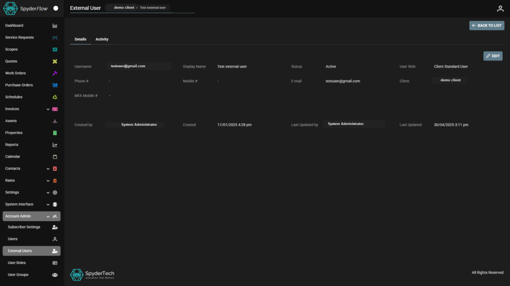 - SpyderFlow Main Menu –> Account Admin –> External Users (External Roles)