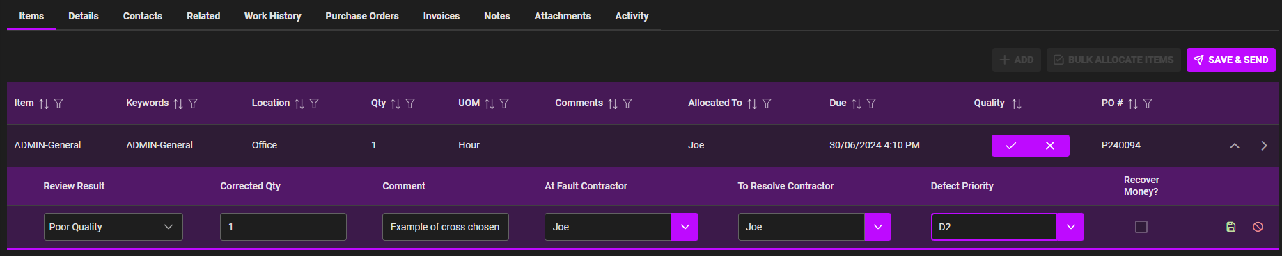 - Open Work Order to the Item and tick for complete. This displays a green tick (work item complete with no issues).
