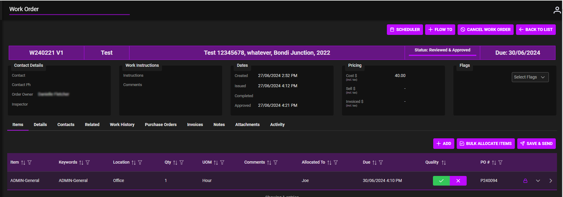 - Work Order Status will change from Created to Allocated. When complete to Reviewed and Approved. For more information: see link Work Orders | WEB | Status