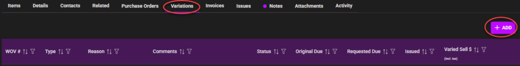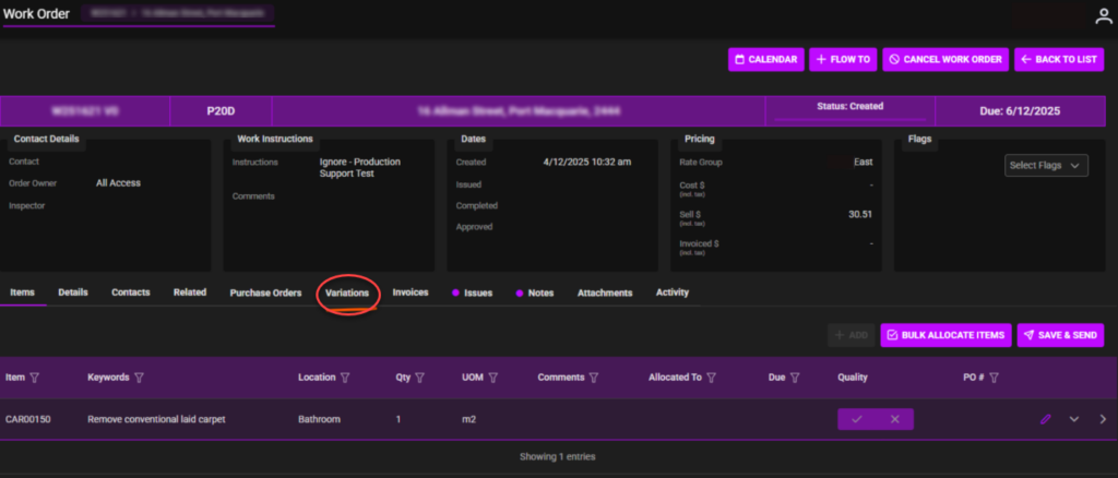 - Open the Work Order > Variations Tab