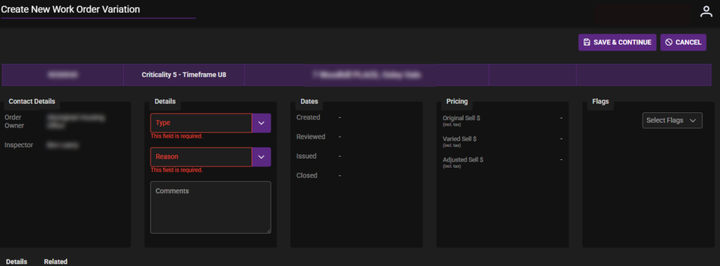 Fill in page Create New Work Order Variation with Type and Reason (from Dropdowns). Then Click Save & Continue