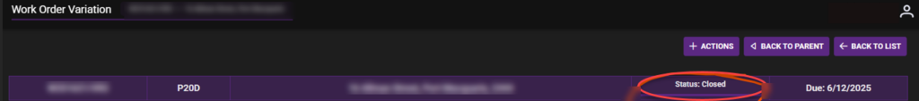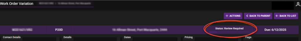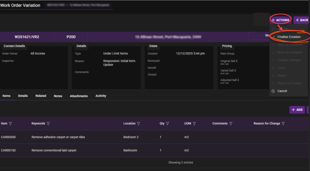 - Status: Closed – This will update the Work Order Variation status to closed & add the items to the Work Order.
